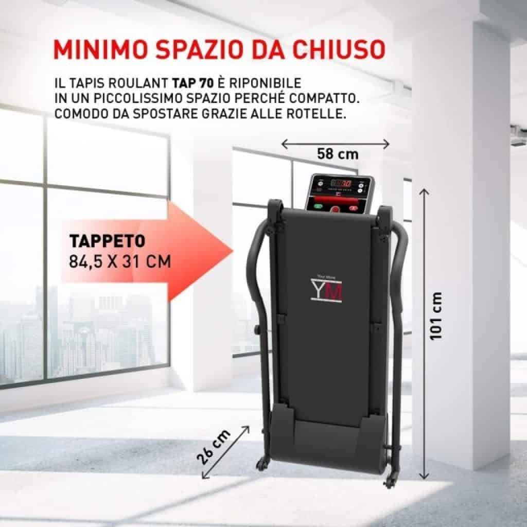 Il tapis roulant elettrico YM TAP70 è stato progettato in modo specifico per un allenamento semplice ma estremamente efficace. È infatti indicato per la camminata, in modo da poter svolgere un esercizio cardio quotidiano e mantenere la forma fisica. Ha un design minimale, tutto made in Italy, che lo rende compatto sia quando viene ripiegato, ma anche quando è in utilizzo, in quanto è realizzato sfruttando tutto lo spazio della pedana per la superficie di corsa. Prende infatti pochissimo spazio e può essere sistemato ovunque. Un tapis roulant essenziale, quindi, dall’ottimo prezzo di acquisto e affidabile, realizzato in materiali robusti, dotato di un ottimo motore che eroga una potenza regolabile in modo lineare che si traduce in un funzionamento stabile e continuo tra 1 e 7 km/h. Ha diverse funzionalità pratiche tramite display touch, come il controllo della velocità, della distanza, del tempo, delle calorie consumate e tasti di scelta rapida per l’incremento e la riduzione lineare della velocità e la scelta tra tre diversi programmi di allenamento. Viene fornito preassemblato; basta serrare solo tre bulloni e il tapis roulant appena consegnato è subito pronto per essere utilizzato. Il nostro consiglio, prima dell’acquisto, è di verificare le proprie esigenze, visto che si tratta di un tapis roulant per il quale è consigliata un’altezza massima dell’utente di 170 cm e con un numero di scarpe non superiore al 41.